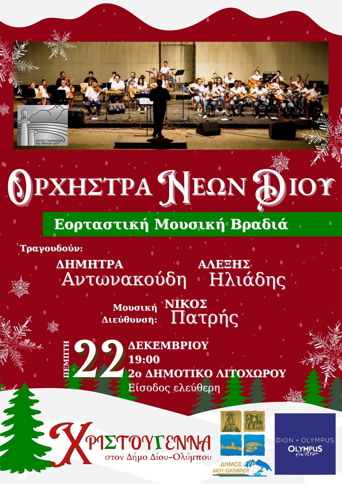Η Ορχήστρα Νέων Δίου υπό τη μουσική διεύθυνση του Νίκου Πατρή θα πραγματοποιήσει την Πέμπτη 22 Δεκεμβρίου μία μεγάλη εορταστική μουσική βραδιά στην αίθουσα εκδηλώσεων του 2ου Δημοτικού Σχολείου Λιτοχώρου στις 7μ.μ. Θα τραγουδήσουν η Δήμητρα Αντωνακούδη και ο Αλέξης Ηλιάδης. Συμμετέχουν η Χρυσάνθη Ευαγγελοπούλου, η Γεωργία Μαρινοπούλου και ο Θωμάς Χατζήνας. Μία διοργάνωση του ΟΠΑΔΔΟ.