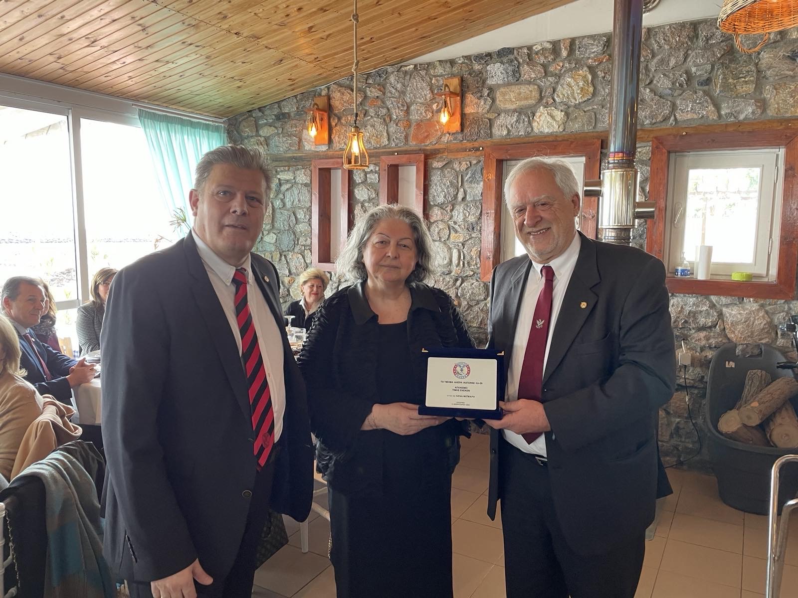 Ακολούθησε γεύμα προς τιμή των νέων μελών και των προσκεκλημένων αξιωματούχων όπου έγινε τιμητική απονομή πλακέτας στην κ. Νένα Μεϊμάρη για τη συνεχή πολύπλευρη στήριξη του τμήματος AHEPA KATERINI και η καθιερωμένη κοπή βασιλόπιτας με 4 τυχερούς. Από τα μέλη ΑΧΕΠΑ ο ταμίας της Περιφέρειας Χρήστος Μπακούρος, από τους επισκέπτες ο κ. Δημήτριος Πλιάφας και από τις κυρίες η Νένα Μεϊμάρη και η Γεωργία Μιχαήλ.