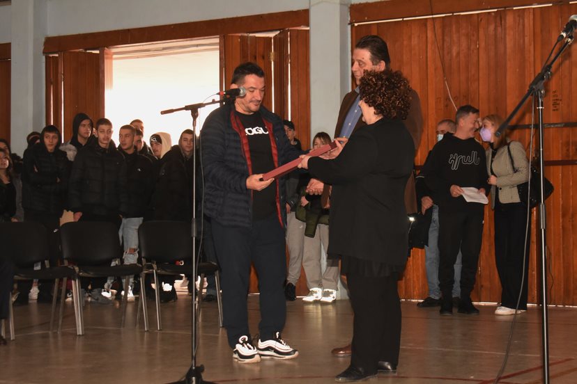 Στο τέλος η διευθύντρια του σχολείου, κα Κοκκίνου Μαρία απένειμε τιμητική πλακέτα στον Πύρρο Δήμα, με ιδιαίτερη αξία διότι την φιλοτέχτησαν οι μαθητές του τμήματος αργυροχρυσοχοΐας του σχολείου, με τις οδηγίες του καθηγητή τους κ. Χαράλαμπου Καλαΐτζίδη.