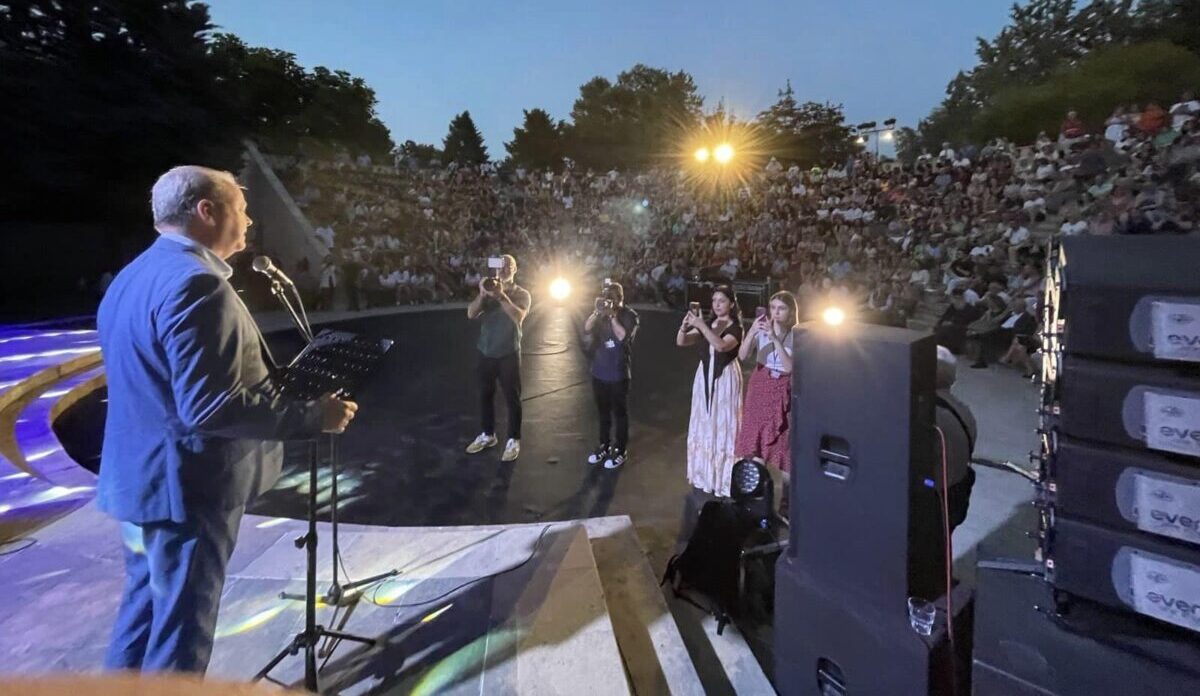 Ο Δήμος Κατερίνης, το Υπουργείο πολιτισμού και η Πρεσβεία της Γεωργίας «συνάντησαν» χτες το βράδυ, το 52ο Φεστιβάλ Ολύμπου, στο κατάμεστο Δημοτικό Θέατρο Πάρκου. Ένα φαντασμαγορικό «παιχνίδι» μεταξύ χορού, μουσικής, τραγουδιού και φωτός, με έμφαση σε λαογραφικά στοιχεία της Γεωργίας από το διεθνούς φήμης Ακαδημαϊκό Εθνικό Σύνολο Μουσικής και Χορού «Erisioni» της Γεωργίας, που υποδέχτηκε ένθερμα το κοινό.