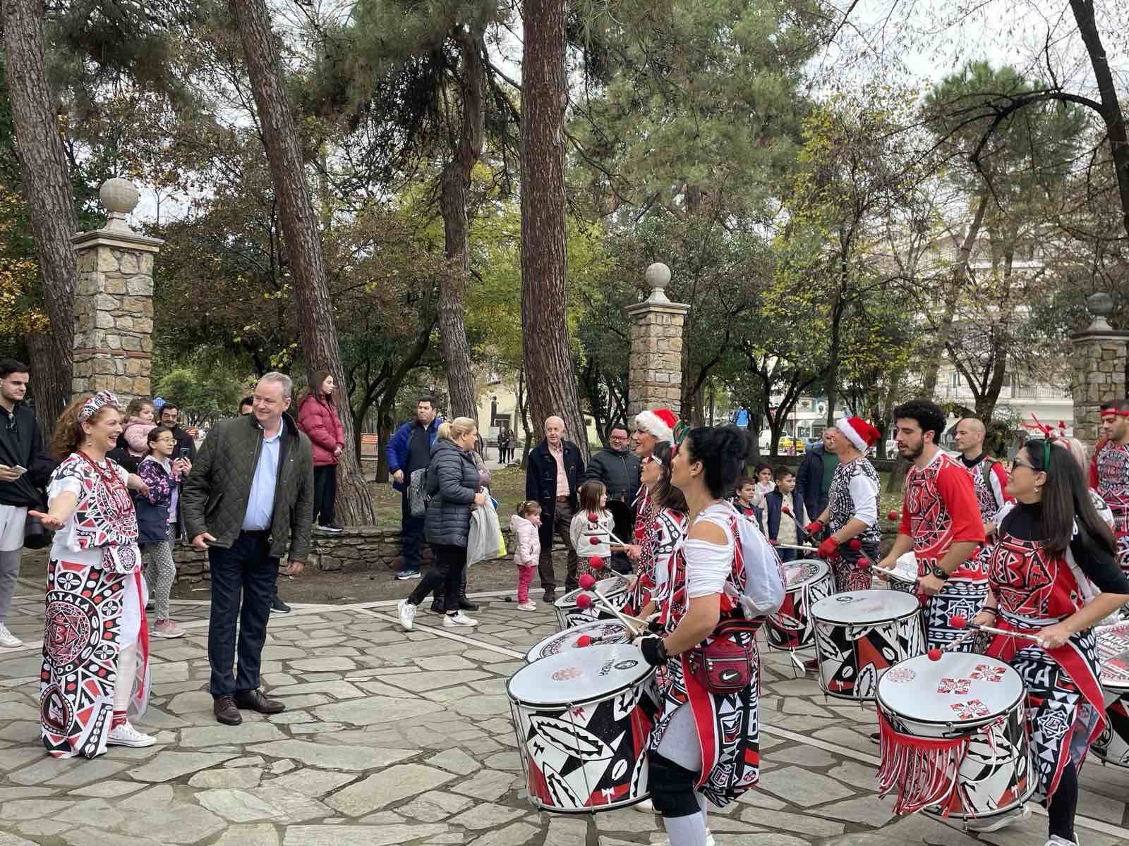 Οι Batala Salonica με ένα ισχυρό συνδυασμό κρουστών και βραζιλιάνικου χορού και ήχου ξεσήκωσαν τους πάντες στο πέρασμά τους, ενώ η κεντρική πλατεία γέμισε με χριστουγεννιάτικες φιγούρες, μασκότ, «face-painting», αλλά και μπαλονοκατασκευές που ενθουσίασαν τα παιδιά.